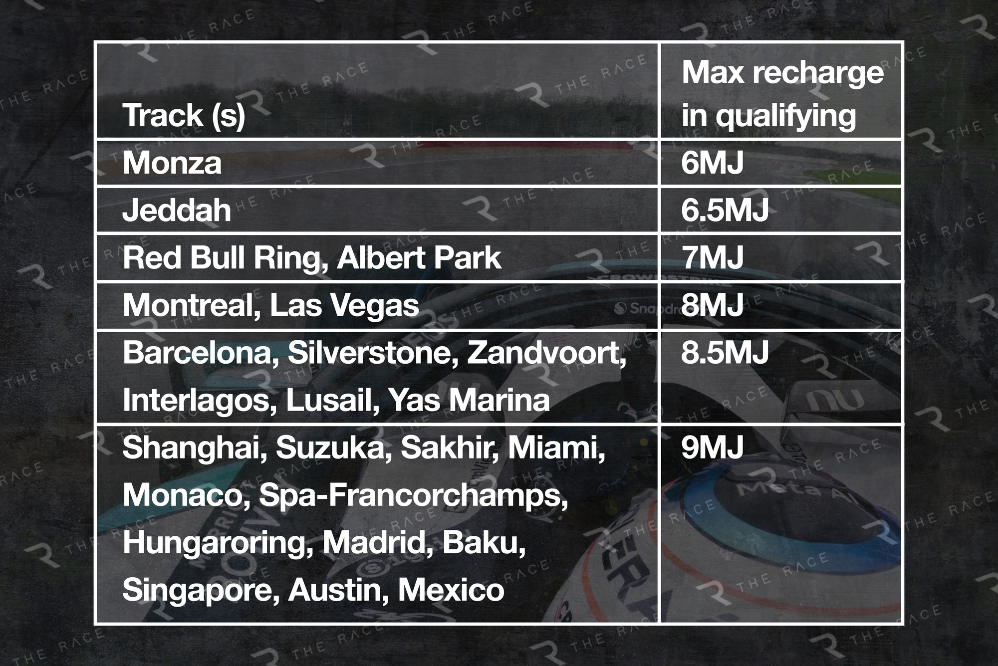 FIA’nın her pistte sıralama turlarında uyguladığı enerji geri kazanım limiti, pistlerin enerji gereksinimleri açısından nasıl sıralandığına dair önemli bir içgörü sunuyor.
