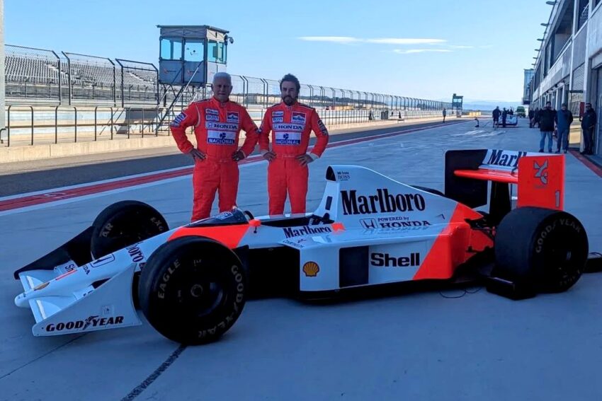 McLaren CEO’su Zak Brown’ın, Ayrton Senna’nın 1990 McLaren MP4/5B aracının sahibi olarak sağladığı imkânla Fernando Alonso, babasına büyük Brezilyalı sürücünün ikonik aracını sürme fırsatı sundu. Bu özel an için ikili, döneme ait ‘Senna’ tulumlarıyla piste çıktı.