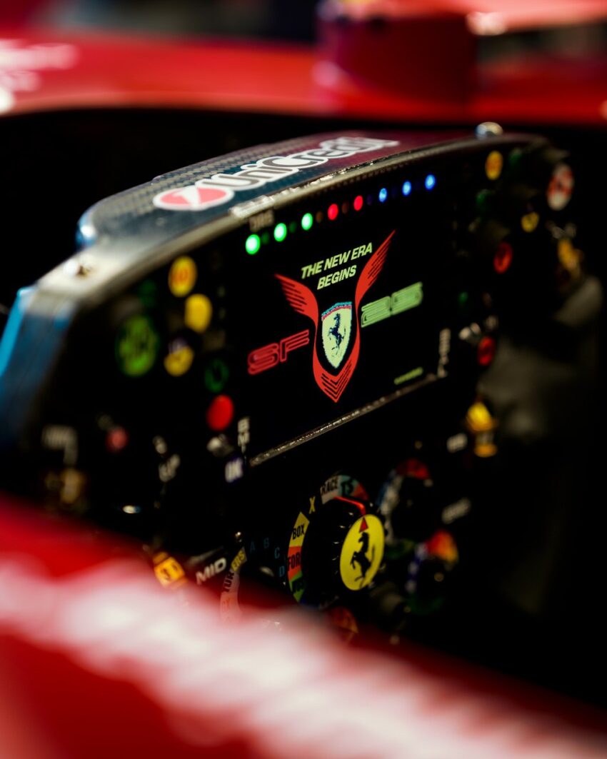 Hamilton’un logosu + Ferrari’nin Şahlanan Atı + SF 25 model kodu birleşimiyle hazırlanan tasarım, ekranın ortasında büyük harflerle “THE NEW ERA BEGINS” yazısıyla taçlandırıldı.