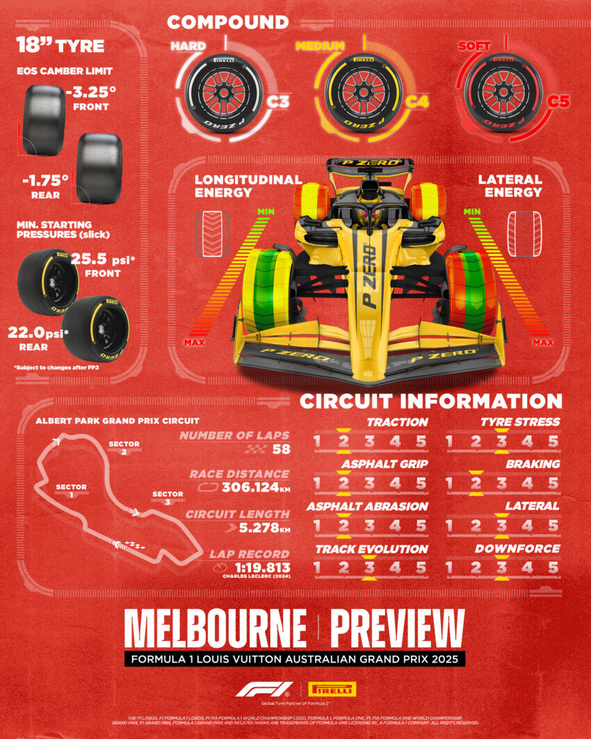 Pirelli, 2025 sezonunun ilk yarışı için C3 sert, C4 orta ve C5 yumuşak hamurlarını belirledi. Geçtiğimiz sezonla aynı seçim yapılmış olsa da lastiklerde bazı değişiklikler var.