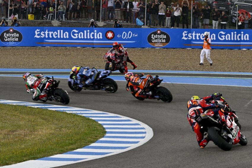 Ducati pilotu Marc Marquez, Jerez’de cumartesi günü gerçekleştirilen bayrak değişimli sprint yarışında bitime beş tur kala kaza yaptı. Ancak Marquez, hasar gören motosikletine tekrar binerek 13. virajda çimenlerin üzerinden geçip pit alanına yöneldi ve ıslak zemin için hazırlanan motosikletine geçti.